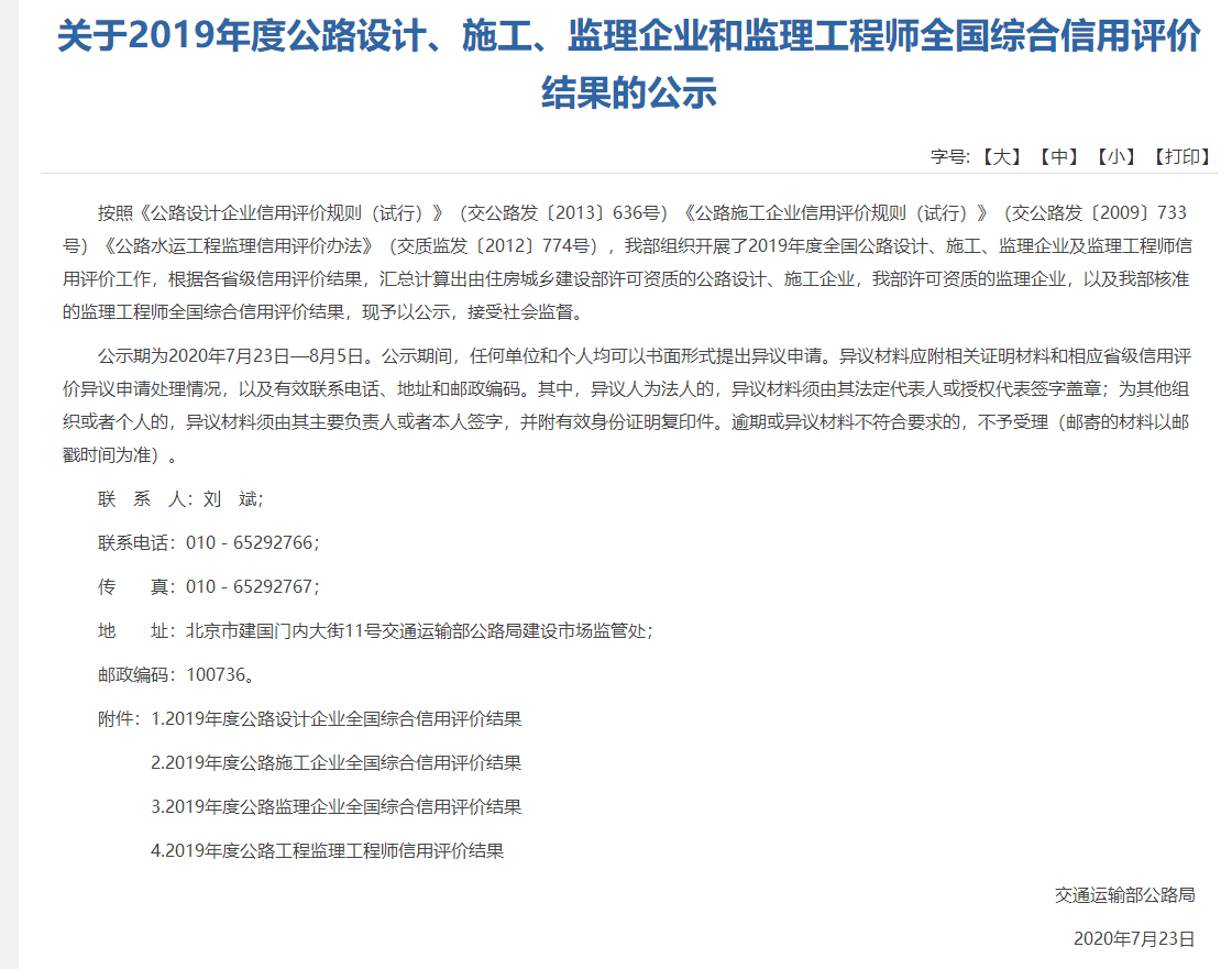 交通運輸部《關(guān)于2019年度公路設(shè)計、施工、監(jiān)理企業(yè)和監(jiān)理工程師全國綜合信用評價結(jié)果的公示》我院獲得AA級