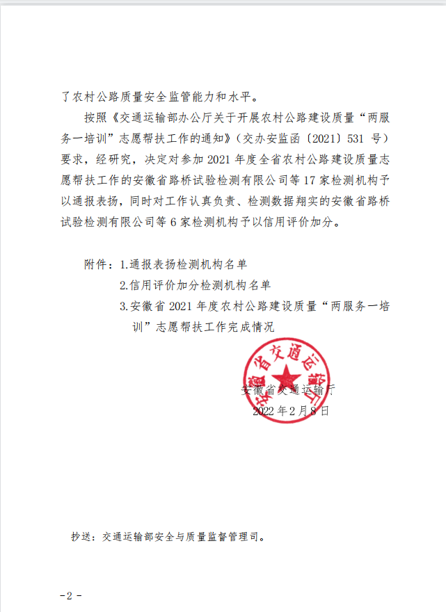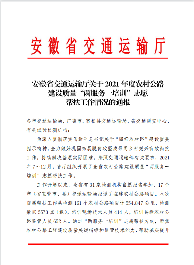 新年伊始,檢測中心即收到省交通運(yùn)輸廳發(fā)來的通報表揚(yáng)信,同時作為全省唯